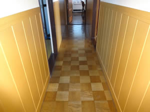お客様の了解を得て、小さいフローリングを使用させていただきました。またフローリングの厚さの選択も考慮が必要です。昔はドアの下など敷居を入れる納まりが多く、廊下の床面よりも敷居が上がっていました。 この敷居が上がっていると新しくフローリングを重ね貼りしても納まりますが、もし廊下と部屋の床の高さが同じだった場合、廊下床面がその他の部屋よりも上がってしまいます。 こうなるとドアの開閉の問題や段差が生じるといった問題などいろいろ出てきます。重ね貼りの場合は床高や選択するフローリングの厚みなど総合的に考慮する必要があります。